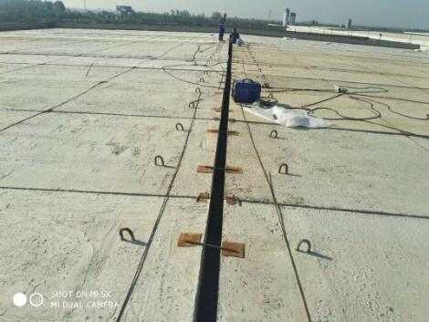 盤錦二期糧倉8#~14#屋面總面積一萬多平米,功能為散裝糧食倉儲,承裝水稻,平房倉的耐火等級為二級,屋面防水等級為Ⅰ級,做兩道防水層。糧倉屋面結(jié)構(gòu)采用的是寬2.4mⅹ長18m預(yù)制混凝土板,板與板之間以及屋面與女兒墻之間都存在拼縫,如圖1所示。在預(yù)制混凝土板之上再澆筑一層50mm厚細(xì)石混凝土,作為結(jié)構(gòu)基層。