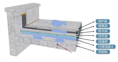由于屋面采用預(yù)制混凝土板拼接,屋面拼縫多,并且預(yù)制板后期的結(jié)構(gòu)變形也會比較大,這就容易導(dǎo)致預(yù)制板上層細(xì)石混凝土結(jié)構(gòu)板開裂,所以整個屋面結(jié)構(gòu)自防水性能較差。