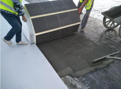 第一道BAC-P防水卷材施工完畢后,撕除卷材上表面隔離膜,在自粘卷材上再進(jìn)行外喜防水保溫一體化板濕鋪。為了使外喜板能夠與自粘卷材達(dá)到滿粘,消除竄水,提升整個防水保溫層的整體性,施工中有以下幾個要點。